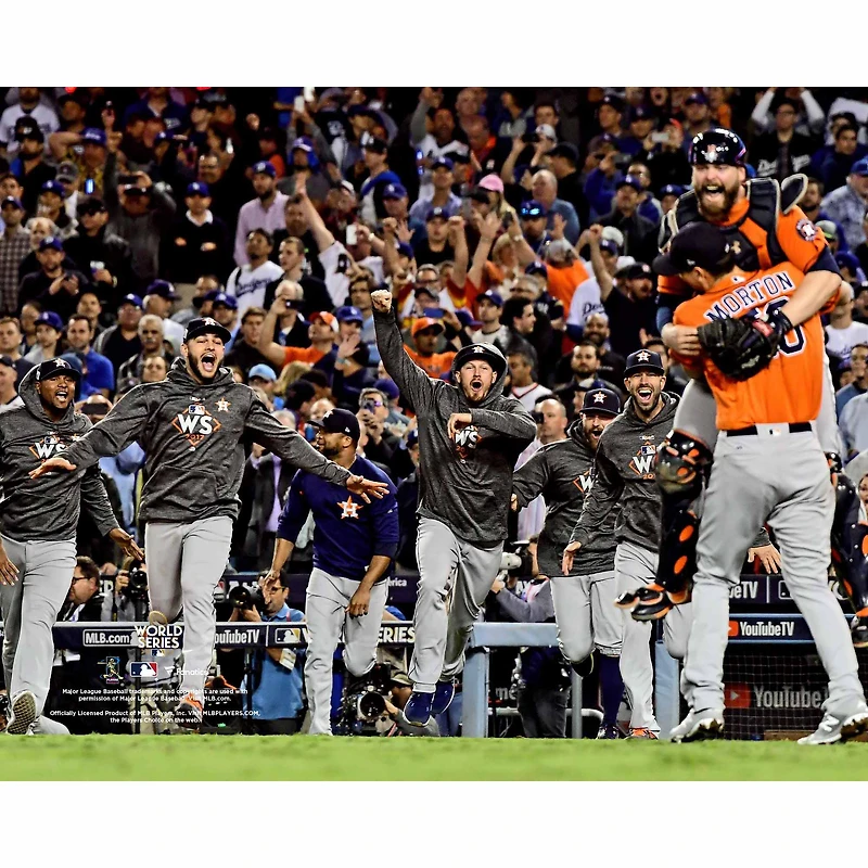 Les Astros de Houston explosent en sortant de l'abri après leur victoire au titre sur cette photo de célébration des champions de la Série mondiale 2017 de Fanatics Authentic. Le lanceur Charlie Morton a été énorme lors du match 7 qui a permis de remporter la série, lançant quatre manches en relève et terminant le match avec un retrait au sol de Corey Seager. Morton et le receveur Brian McCann partagent une étreinte enthousiaste dans ce magnifique morceau d'histoire.