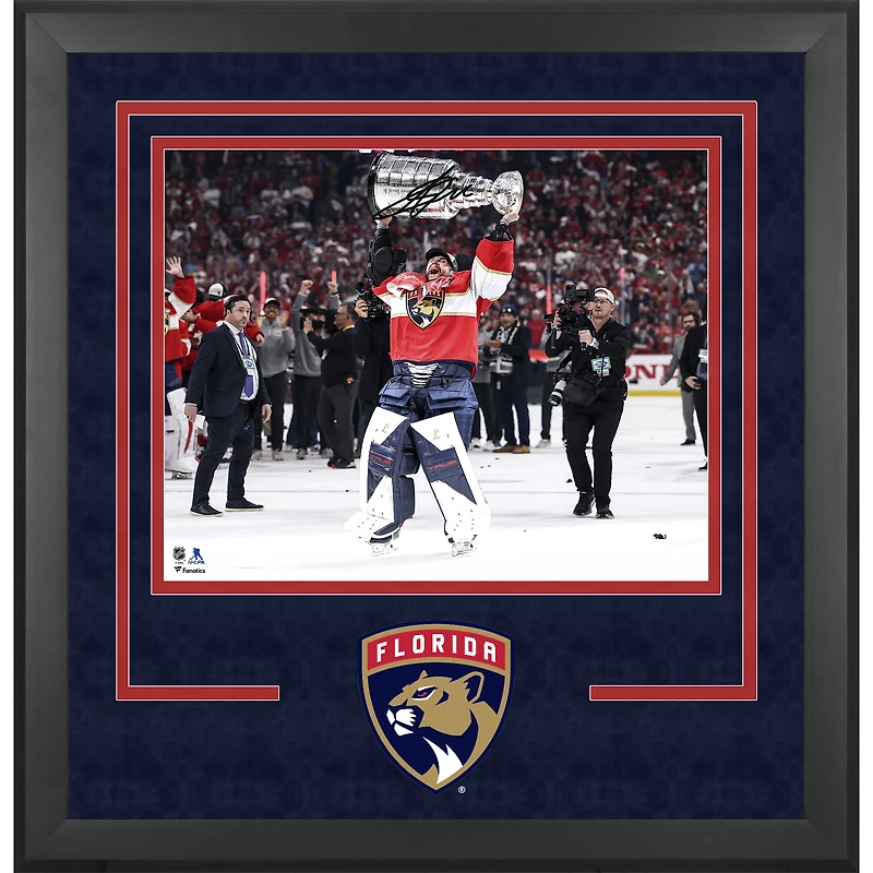 Photographie encadrée de luxe autographiée par Sergei Bobrovsky, champion de la Coupe Stanley 2025, 40,6 x 50,8 cm, des Panthers de la Floride, soulevant la Coupe