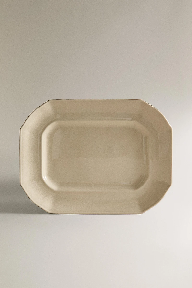 Plat en porcelaine avec finition craquelée, de forme rectangulaire et motif en relief sur la bordure.