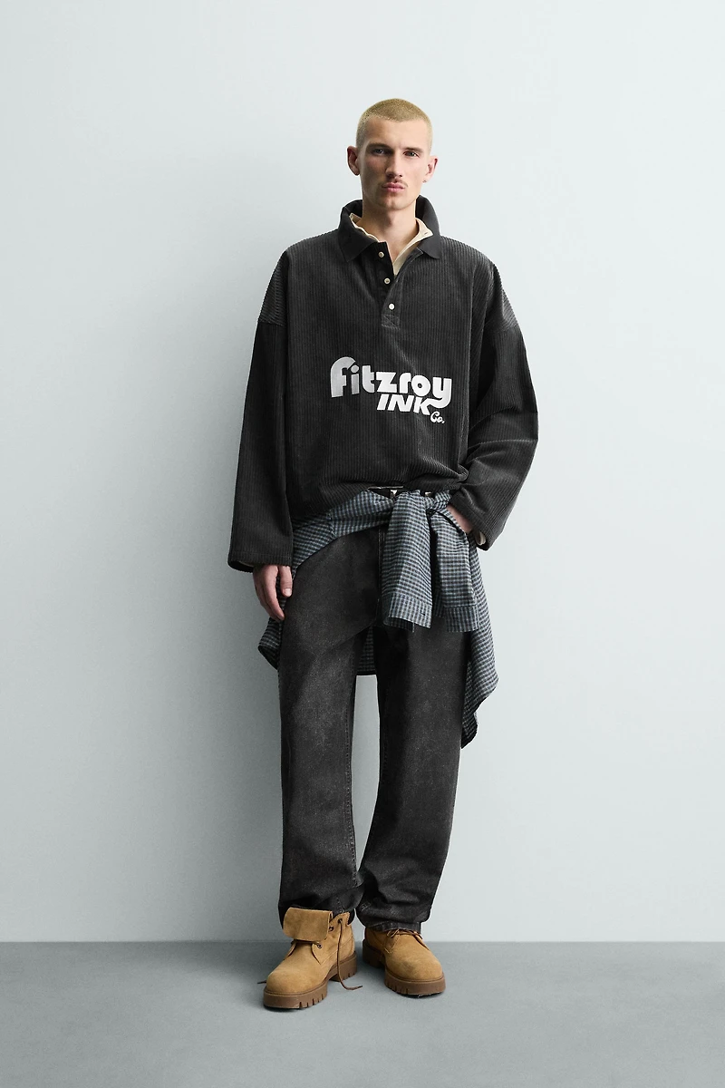 Polo coupe courte confectionné en velours côtelé de coton. Col à revers avec fermeture boutonnée sur le devant. Manches longues. Broderie combinée à contraste sur le devant.