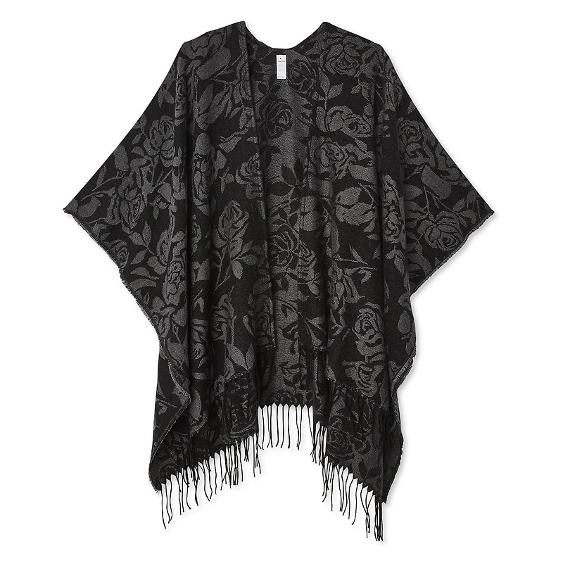 Ajoutez une touche de chaleur et de style par-dessus vos t-shirts à l’aide de ce poncho ruana en jacquard George pour femmes. Confectionné dans un tricot en jacquard, ce poncho ouvert sur le devant est agrémenté d’un imprimé sur l’ensemble et d’une bordure frangée.