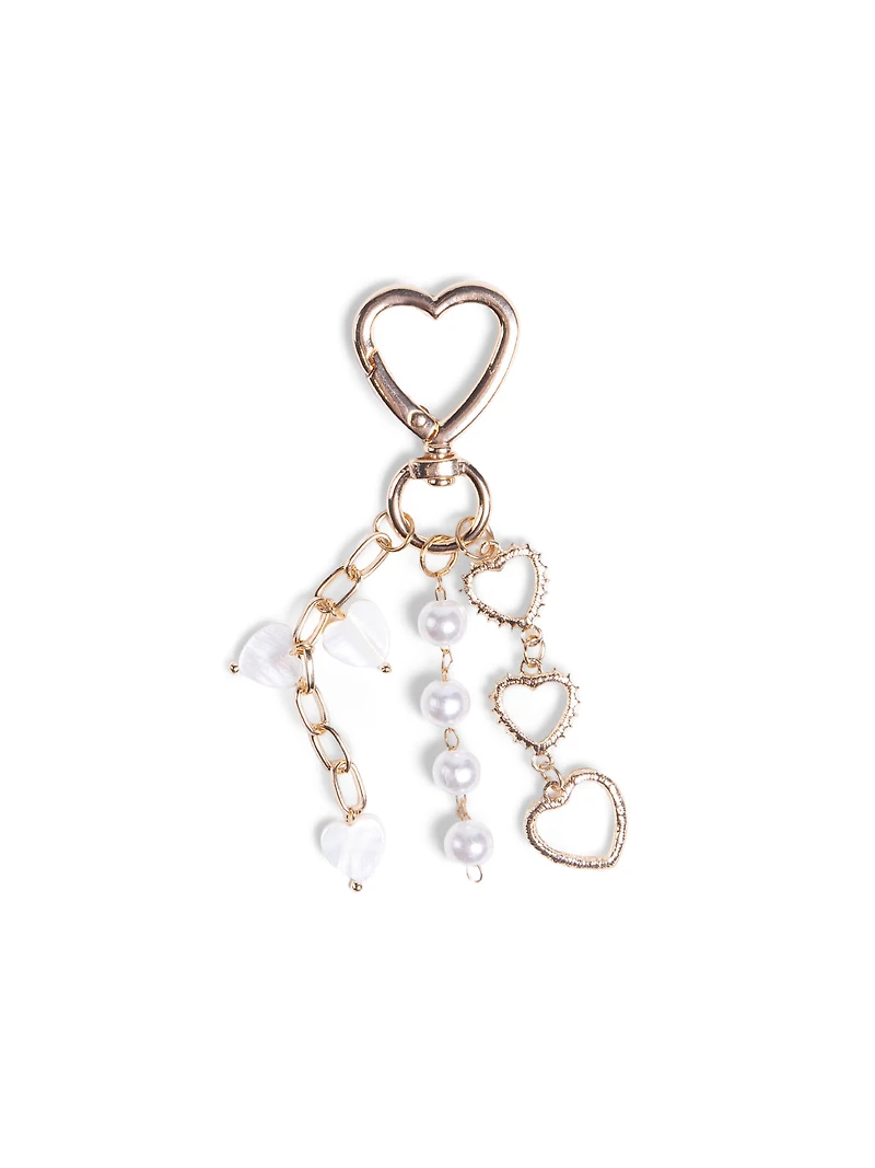 Porte-clés en métal à finition dorée composé d’un mousqueton en forme de cœur et de chaînes pendantes. Le modèle associe des perles blanches alignées, des maillons allongés et des pendentifs cœurs texturés, percés de découpes décoratives.