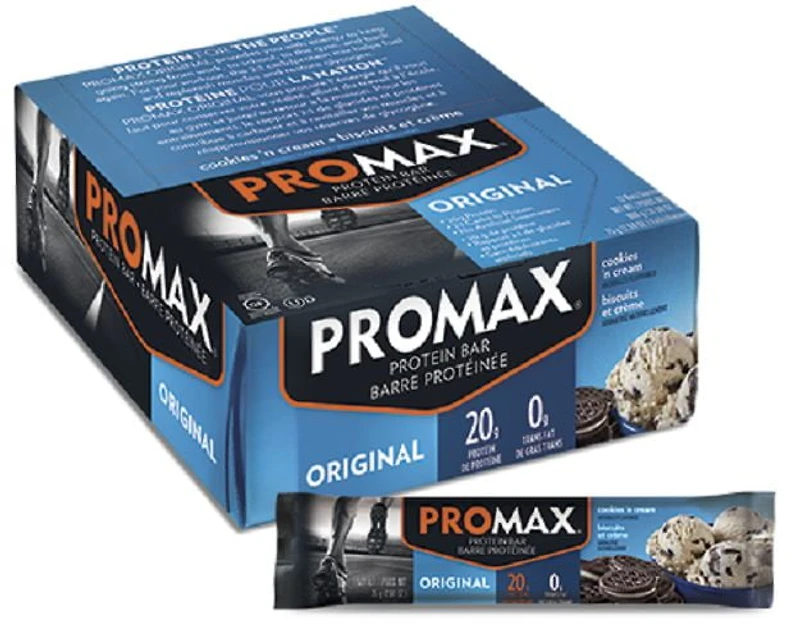 La Barre Promax® Original Biscuits et Crème est un moyen délicieux et nutritif de maintenir votre énergie et de rebâtir les muscles lorsque vous êtes en déplacement, tout en satisfaisant votre envie de sucré. Cette barre met en vedette une saveur de vanille crémeuse combinée à une texture agréable de biscuit croustillant. Non seulement le goût est phénoménal, mais cette barre est parfaite pour les personnes ayant un style de vie actif et sportif alors qu'elle stimule l'énergie grâce à son rapport glucides/protéines de 2:1, vous permettant de foncer à travers votre entraînement prolongé ou votre journée au travail. Nous prenons très au sérieux notre engagement envers la santé et la nutrition et nous croyons qu'un bon goût n'a pas besoin d'être artificiel, alors que nous utilisons de vrais ingrédients dans toutes nos recettes. Prenez cette barre comme substitut de repas ou comme collation satisfaisante que vous pourrez déguster sans vous sentir coupable. Promax, c'est "La protéine pour le Peuple®".Les barres élevées en protéine Promax sont le carburant idéal à prendre sur le pouce pour les styles de vie actifs. Conçues en fonction des gens occupés, nos barres ont un rapport protéines/glucides de 2:1 pour aider à maintenir des niveaux d'énergie élevés et à favoriser à la fois une récupération musculaire efficace et un maximum de gains à la suite d'entraînements ou d'activités sportives.Les glucides et les protéines trouvées dans les barres Promax Original aident à protéger activement les tissus musculaires et à fournir de l'énergie avant votre activité, et travaillent à remplacer le glycogène et à faciliter ultérieurement le renouvellement des tissus. Ces barres sont une délicieuse collation protéinée offrant 18 vitamines et minéraux et 20 grammes de protéines complètes que vous voudrez intégrer à votre routine quotidienne.Promax comprend que le goût est un facteur à considérer lorsqu'on veut bâtir des muscles sans consommer trop de sucre, c'est pourquoi nos barres élevées en protéine vont beaucoup plus loin pour apporter une véritable saveur à la table, et ce, sans inclure de gras trans, d'édulcorants ou d'agents de conservation artificiels, de maltitol, de sirop de glucose à haute teneur en fructose ou de gélatine.Nous croyons que tous devraient avoir accès à une énergie de haute performance, et c'est pourquoi nos produits sont toujours cachers, végétariens, et totalement sans gluten pour répondre aux restrictions et aux exigences de toutes les préférences alimentaires. Promax, c'est "La protéine pour le Peuple®", et nous prenons cette promesse au sérieux.