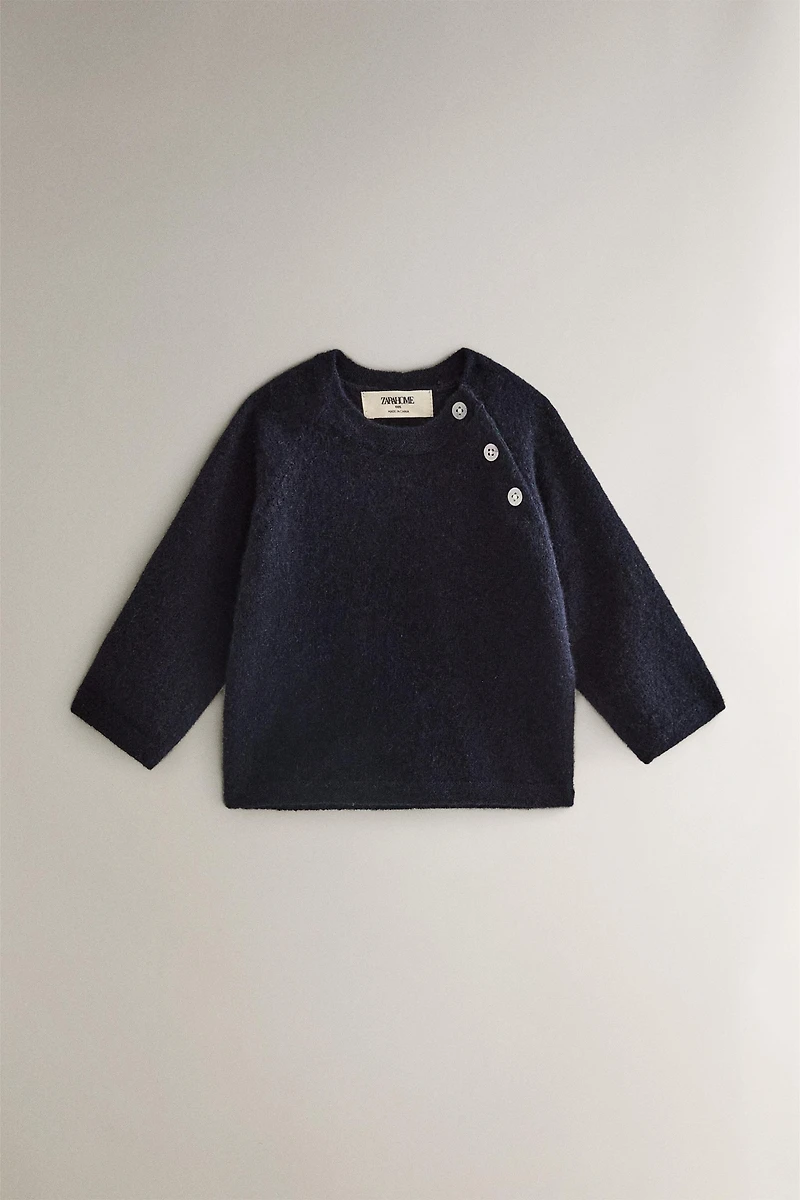 Pull pour bébé en cachemire avec un motif uni et un cache-cou rond. Fermeture boutonnée sur le côté.
