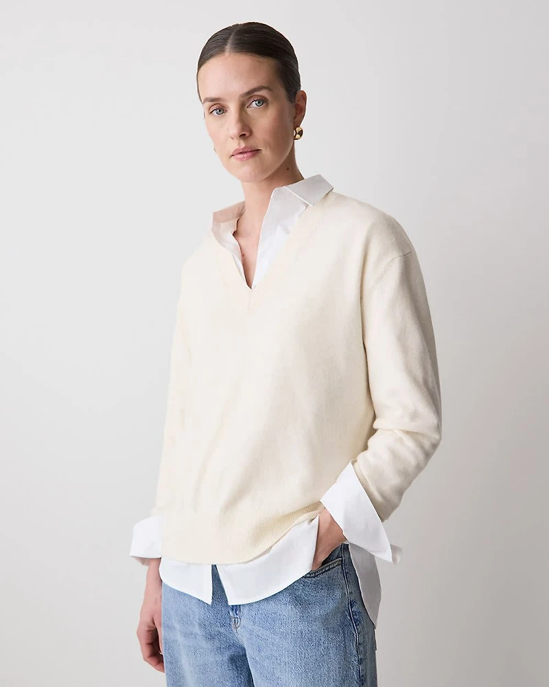 Conçu à 100% en laine mérinos ultra-fine, ce pull offre une respirabilité naturelle, un tombé fluide et un confort luxueux. Une pièce raffinée pour un style décontracté par temps froid. Coupe - Coupe décontractée : Silhouette décontractée avec plus d'aisance au niveau de la poitrine, des bras et de la taille - Manches longues - Longueur avant de 24" (taille M) Caractéristiques - 100% laine mérinos ultra-fine s'apparentant à du cachemire - Col V