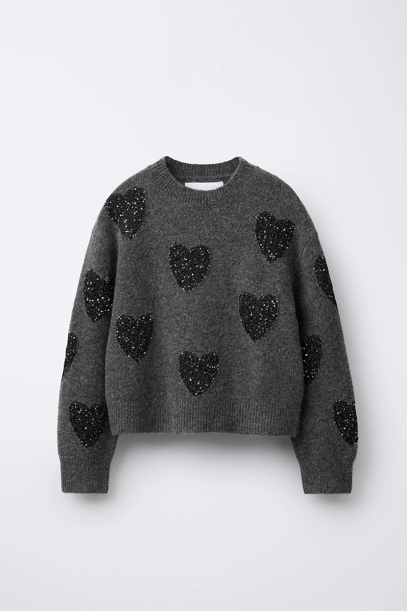 Pull en maille à col rond et manches longues. Imprimé cœurs avec décor de paillettes sur le devant et les manches.