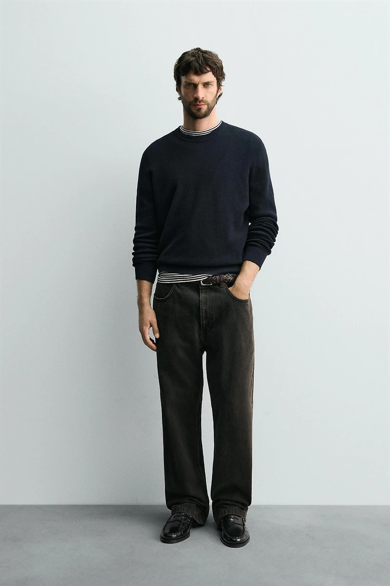 Pull regular fit tissu en filature de coton. Structure waffle. Col rond et manches longues. Finitions en bord-côte.