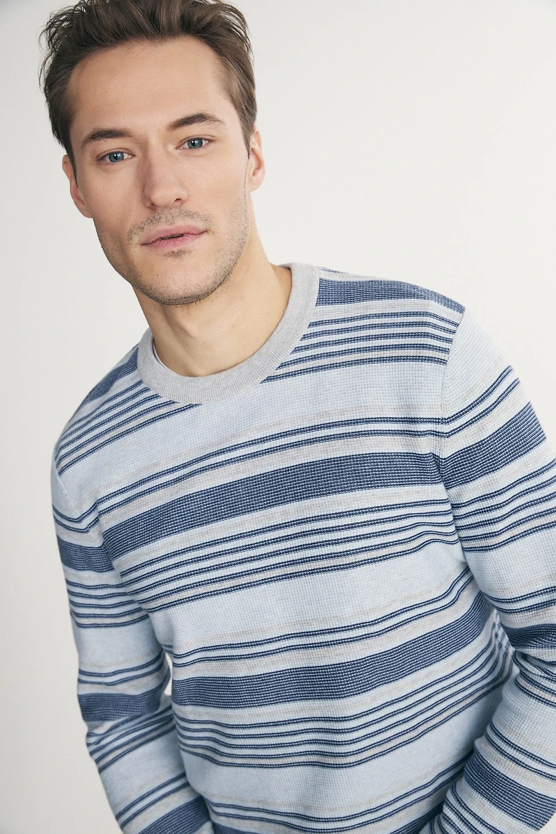 Confectionné en 100 % coton, ce pull rayé texturé offre un look à la fois intemporel et moderne. Son motif de rayures horizontales apporte du dynamisme, tandis que la maille texturée ajoute du relief et de la douceur. Doté d’un col rond classique et de finitions côtelées, il est aussi confortable que facile à porter.
