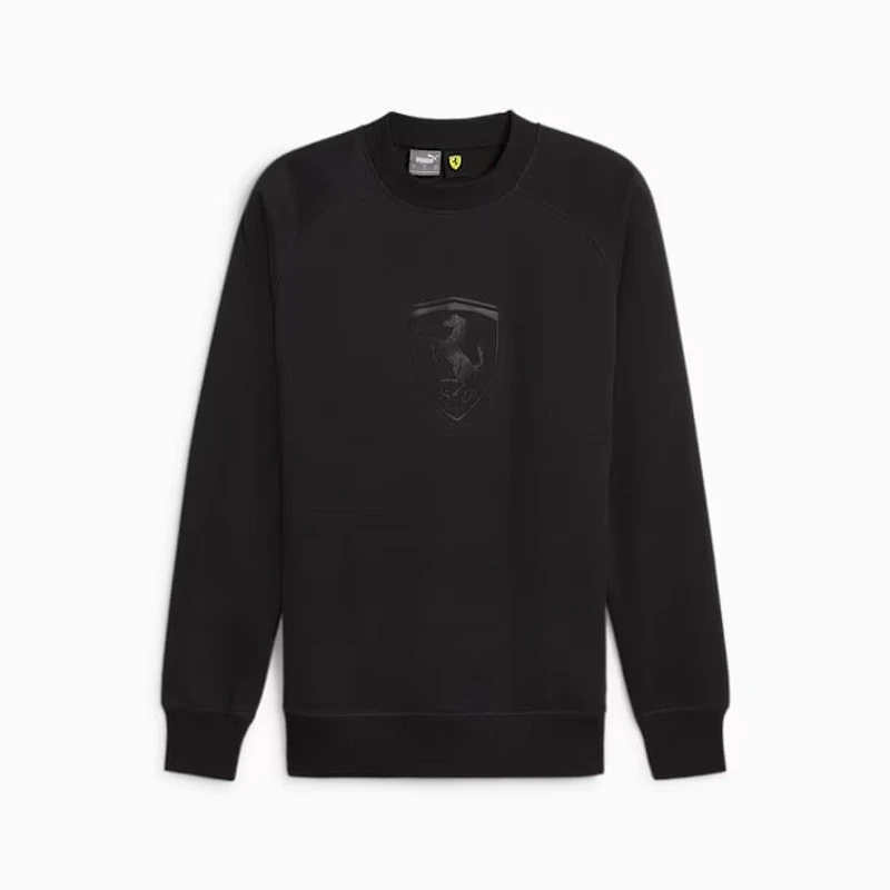 Le sweatshirt Ferrari x Puma affiche l'emblématique écusson du Cheval cabré en sérigraphie ton sur ton sur la poitrine. Coupe régulière et confortable avec manches raglan, col et poignets côtelés pour un style urbain intemporel.
