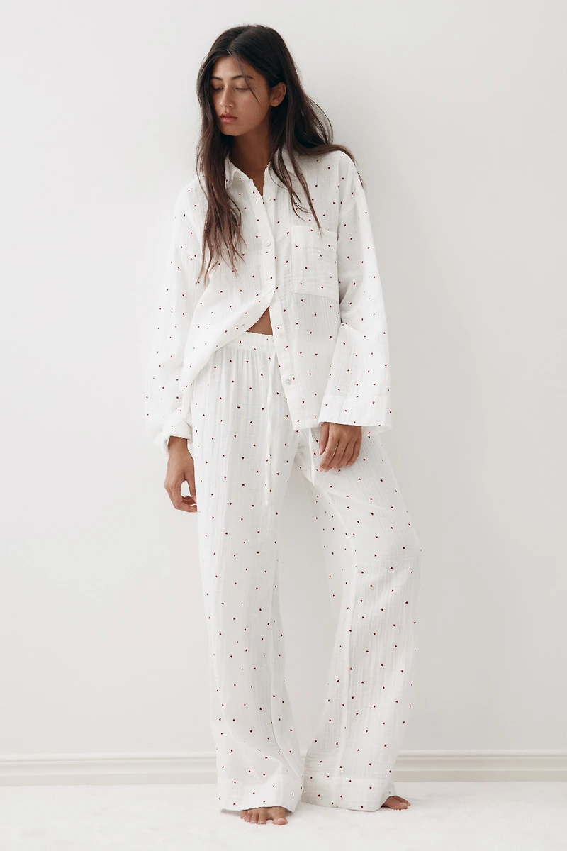 Pyjama en douce mousseline de coton, composé d'une chemise et d'un pantalon. Chemise avec col, poche de poitrine plaquée et boutonnage devant. Emmanchures descendues et manches longues. Pantalon avec élastique et cordon de serrage à la taille. Jambes droites.