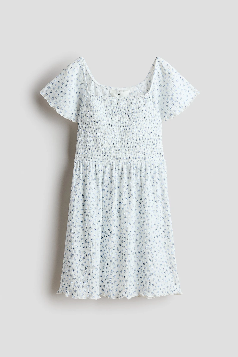 Robe en jersey froissé. Modèle à manches papillon avec encolure carrée, nid d'abeille sur le devant du corsage et jupe évasée. Bord surjeté en bas de manche et au bas.