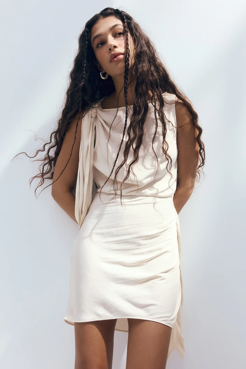 Robe courte et ajustée en tissu légèrement satiné. Modèle sans manches avec encolure bateau délicate et larges rubans à nouer sur une épaule et à la taille, du côté opposé. Fermeture éclair dissimulée sur un côté. Non doublée.
