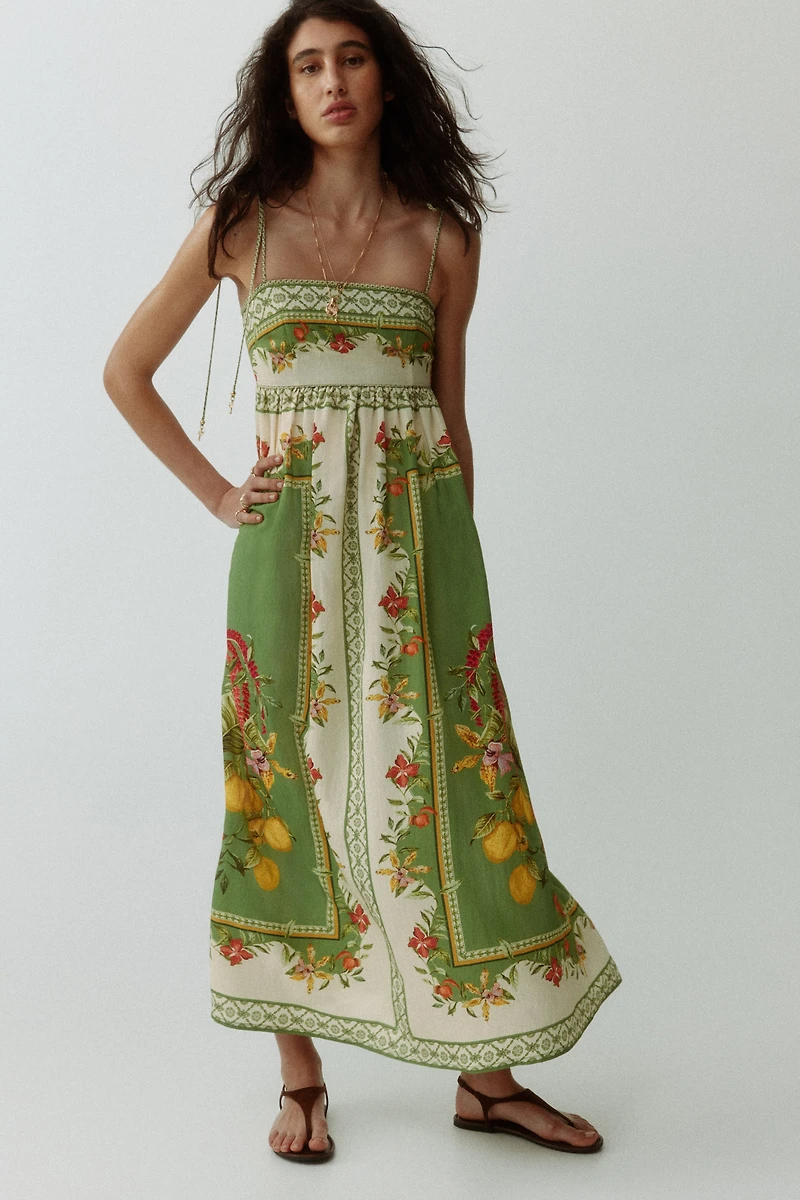 Robe à la cheville en tissu de viscose mélangée avec impression placée. Modèle à encolure droite avec fines bretelles à nouer sur les épaules et corsage ajusté. Partie nid d'abeille au dos. Couture froncée à la taille et jupe légèrement évasée. Poitrine doublée.