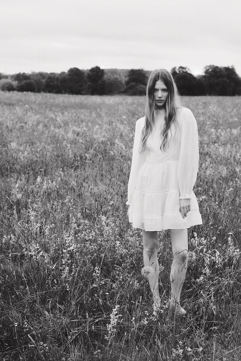 Robe courte en tissu de lyocell mélangé avec insertions de dentelle échelle ajourée. Modèle à col sans rabat à bord volanté et fermeture par bouton et fermeture éclair dissimulées au dos. Longues manches ballon à bord volanté. Jupe à étages agrémentée de fronces. Partiellement doublée.