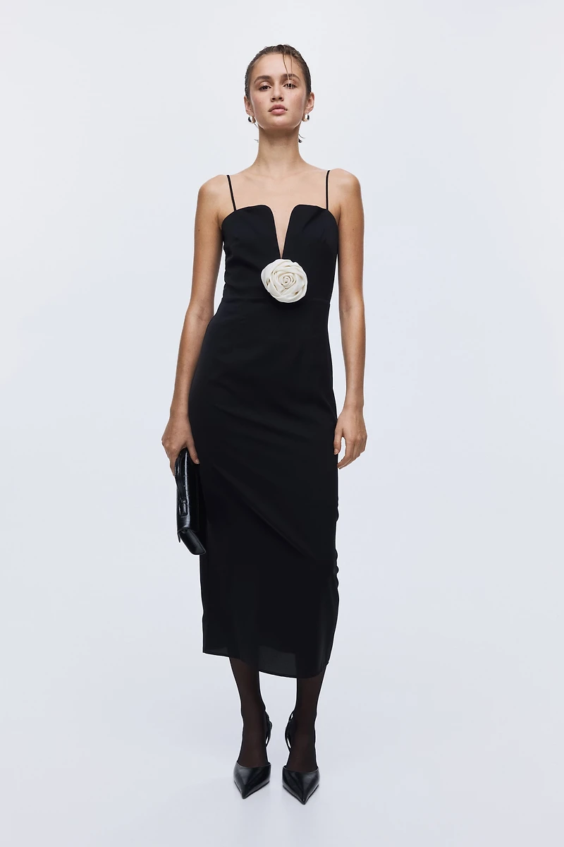 Robe à mi-mollet en matière tissée. Modèle ajusté avec décolleté plongeant agrémenté d'une armature en V au centre de la poitrine et appliqué en forme de rose devant. Fines bretelles réglables. Fermeture par agrafe et fermeture éclair dissimulées dans le dos. Bas droit avec fente dans le dos. Partiellement doublée.