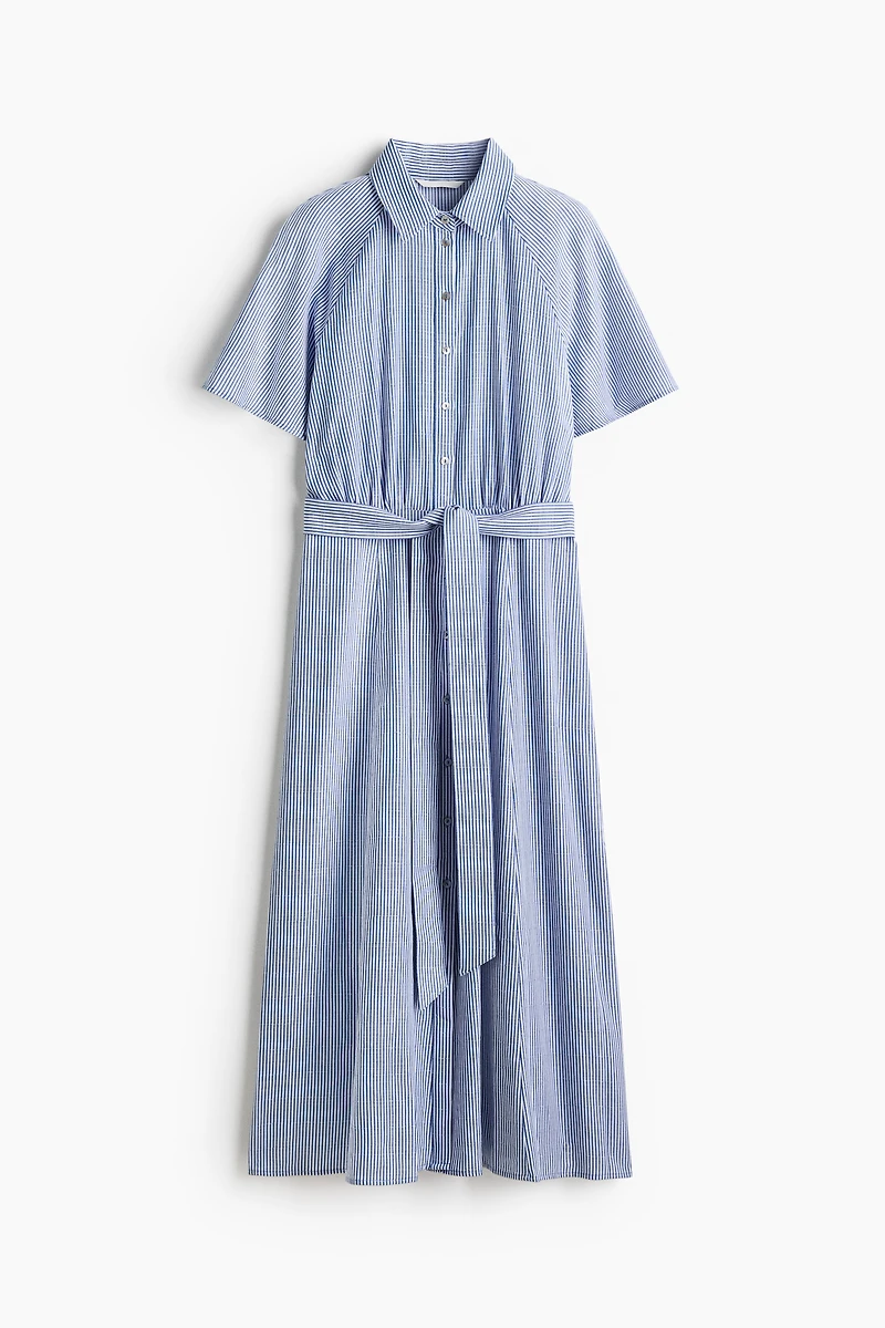 Robe à mi-mollet en matière tissée. Modèle avec col et boutonnage devant. Courtes manches raglan. Ceinture amovible à nouer à la taille et petit élastique dans le dos. Non doublée.