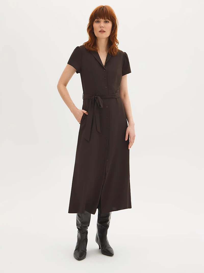 Cette robe chemise mi-longue metde l'avant un col épuré, des manches courtes et une ceinture à nouer qui vient souligner la silhouette avec subtilité et élégance. Dotée de poches latérales et d'un drapé fluide, elle est conçue pour vous accompagner dans tous vos mouvements, du bureau jusqu'au restaurant.