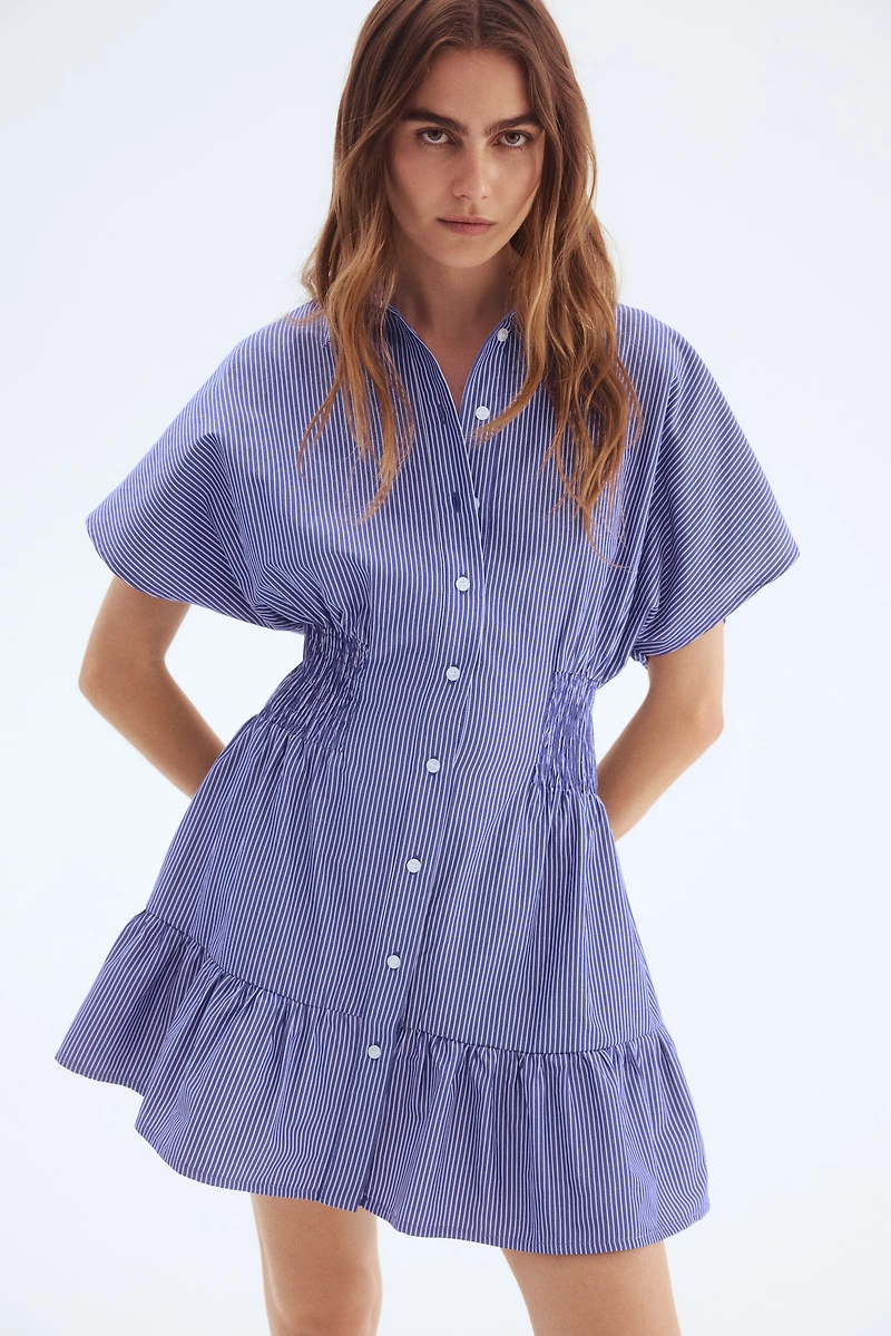 Robe courte en popeline de coton mélangé. Modèle à manches papillon avec col et boutonnage devant. Taille cintrée avec large partie smockée pour une silhouette bien définie. Volant étagé à couture froncée au-dessus du bas. Non doublée.