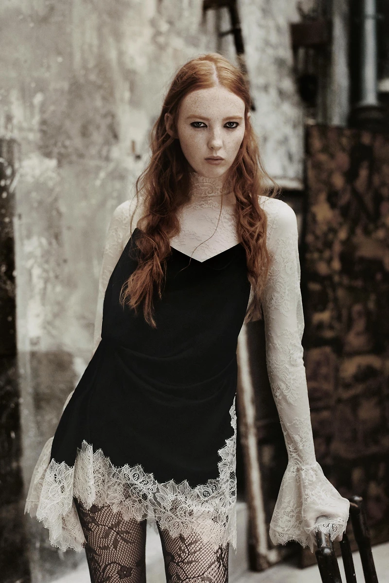 Robe courte confectionnée en tissu de dentelle. Col montant et manches longues terminées par un volant. Détail d'application de tissu en contraste et drapé latéral. Fermeture au dos avec ouverture et boutons.