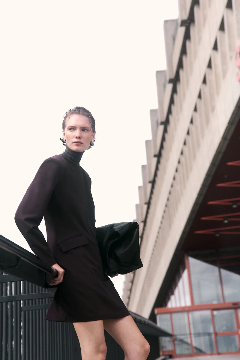 Robe courte et ajustée en sergé. Modèle avec encolure ronde, épaulettes fines et manches longues terminées par poignet fendu. Fermeture éclair dissimulée dans le dos. Pinces devant et dans le dos à la taille et poches passepoilées à rabat devant. Doublée.