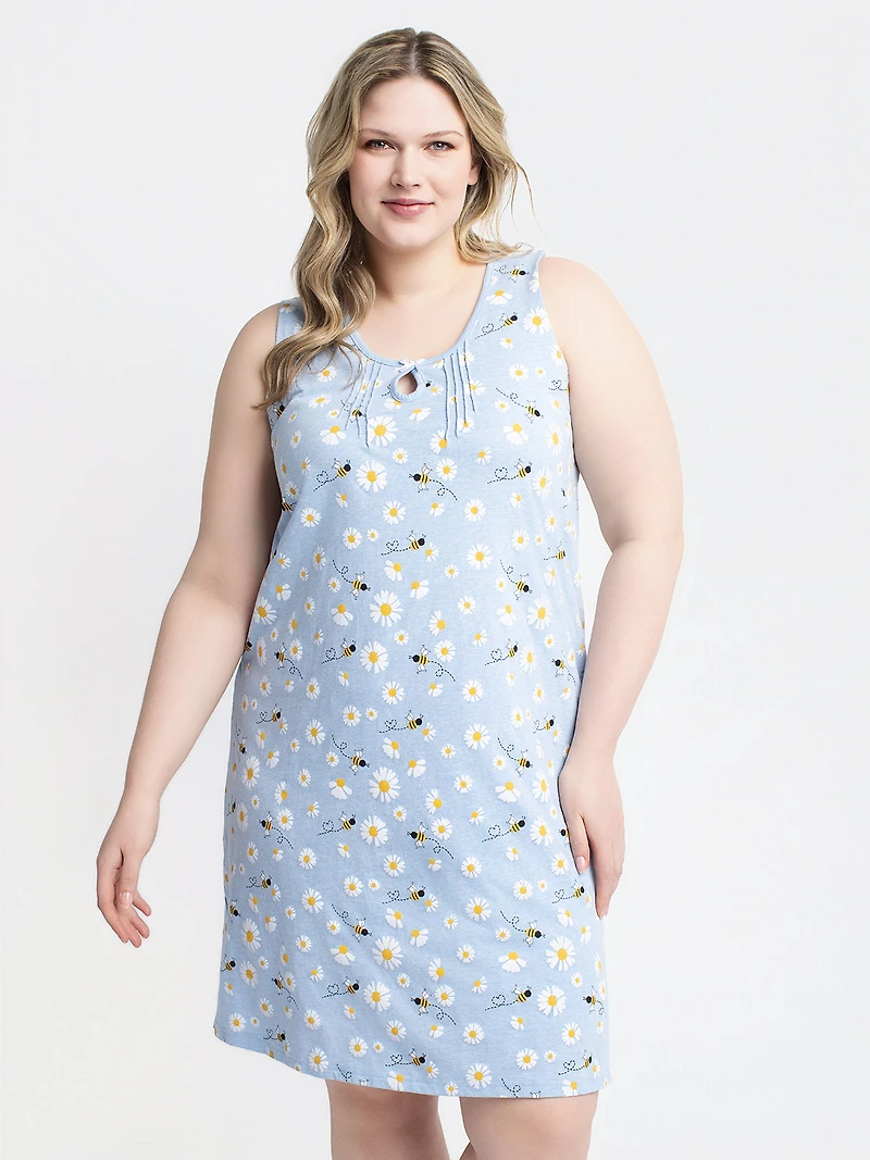 Robe de nuit sans manches avec encolure arrondie et petite ouverture centrale décorée d'une petite boucle. Elle est confectionnée en tissu tricoté extensible imprimé, avec une coupe droite et une longueur au-dessus du genou.