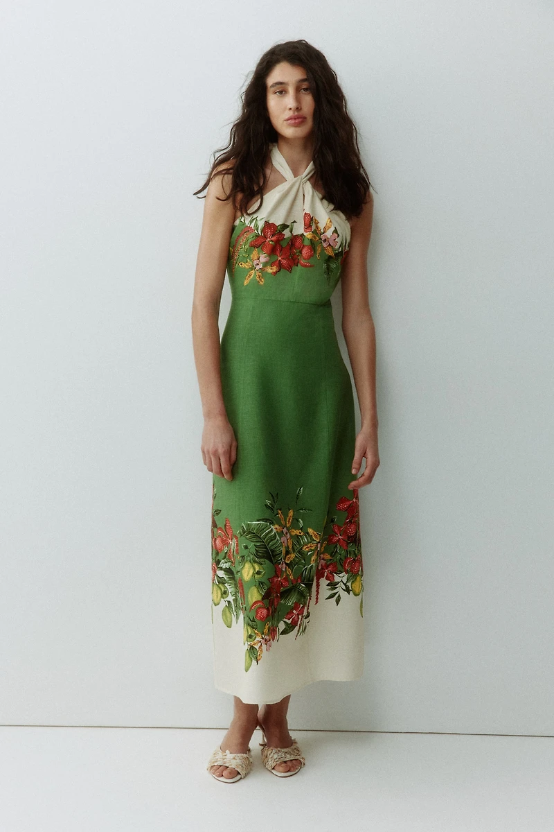 Robe à mi-mollet en tissu de lin et viscose mélangés avec impression placée. Modèle avec col licou passant par une partie torsadée devant et se nouant dans le dos. Corsage ajusté avec fermeture par agrafe et fermeture éclair dissimulées sur un côté. Non doublée.