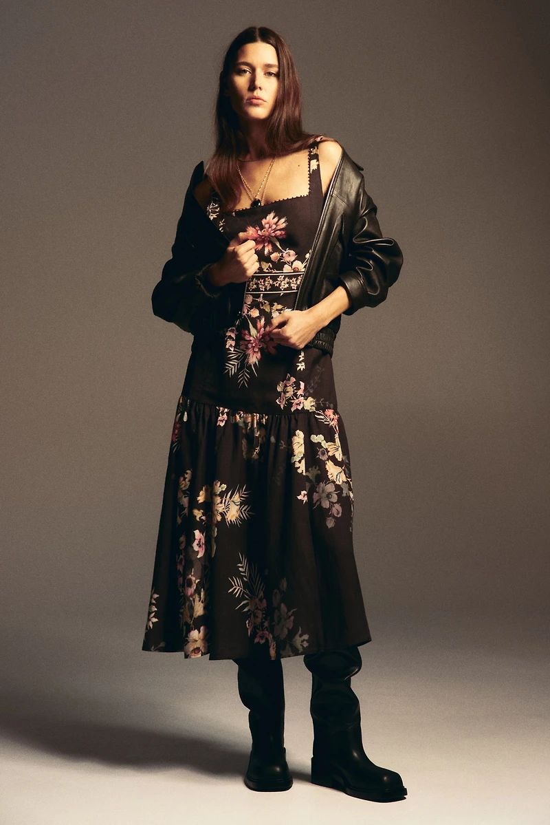 Robe ajustée, à mi-mollet, en tissu aérien de lin et viscose mélangés. Modèle à encolure carrée avec bretelles larges et dos décolleté, agrémenté de larges liens à nouer et d'une fermeture éclair dissimulée. Couture froncée sous les hanches et bas légèrement évasé. Partiellement doublée.