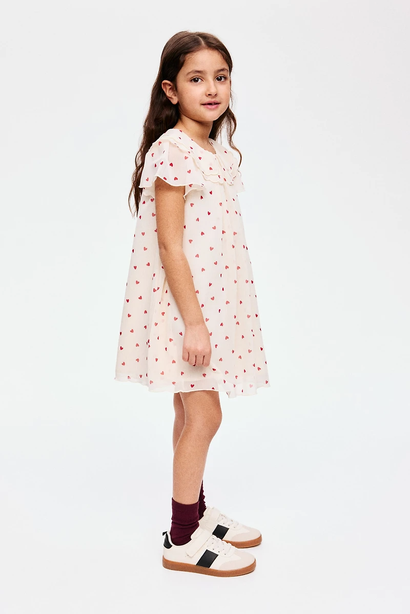 Robe trapèze en mousseline à motif avec bords surjetés. Modèle à encolure ronde avec col Claudine double épaisseur à bord festonné et courtes manches papillon. Petite ouverture surmontée d'un bouton au dos. Bas droit. Doublée.