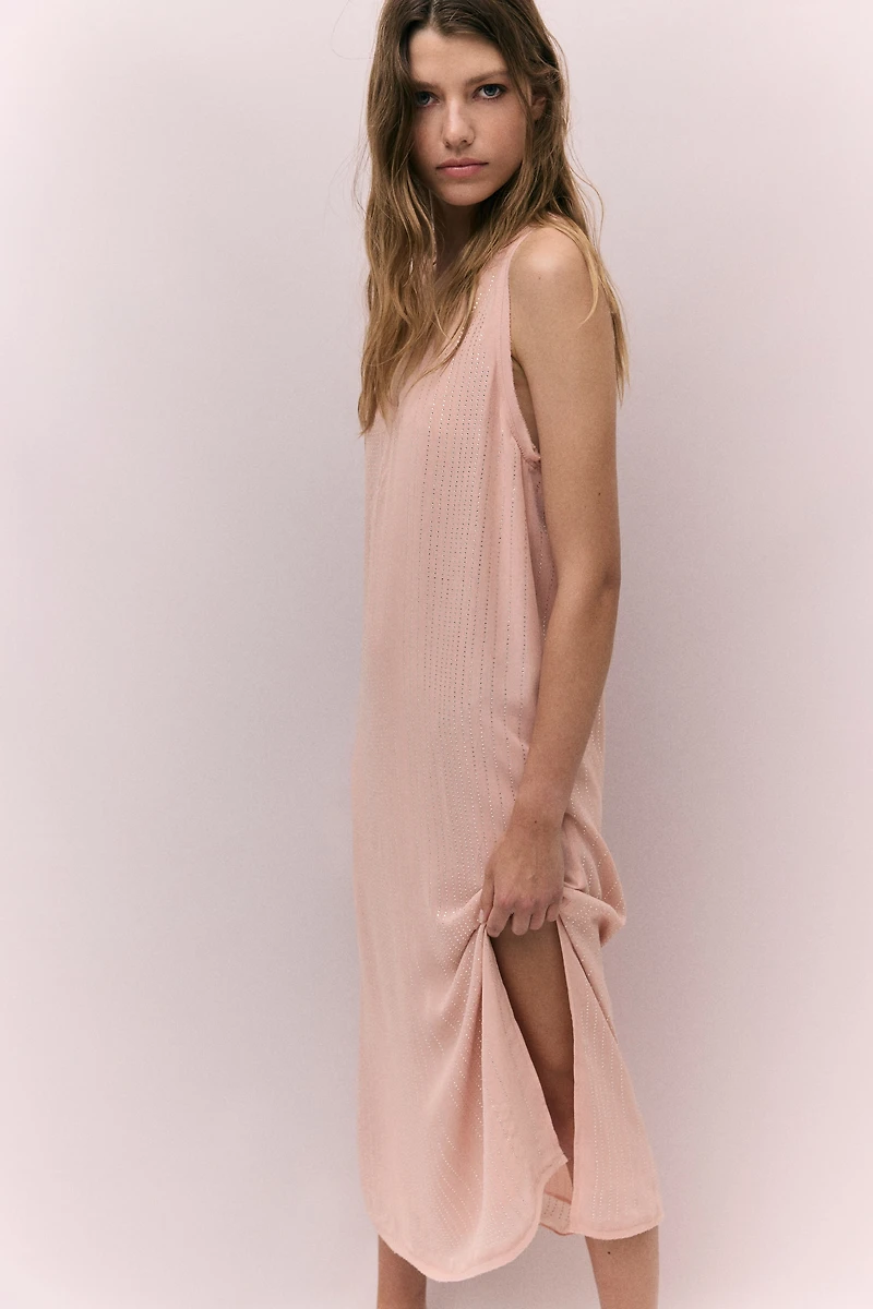 Robe sans manches à mi-mollet, constituée de deux épaisseurs de mousseline vaporeuse, la couche extérieure étant ornée de strass étincelants. Coupe droite à encolure ronde plongeante.