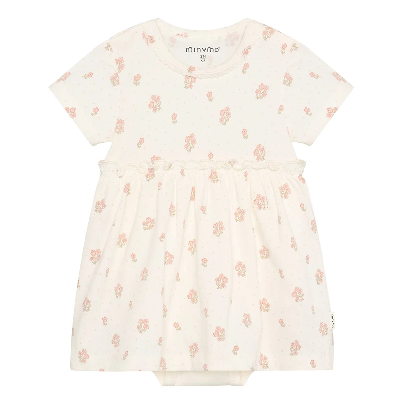 Robe à manches courtes Minymo. Imprimé intégral et col travaillé. Taille élastiquée et body intégré. Confectionnée en coton biologique certifié. Certifiée GOTS - biologique CERES-0366. Composition : 95 % coton / 5 % élasthanne.
