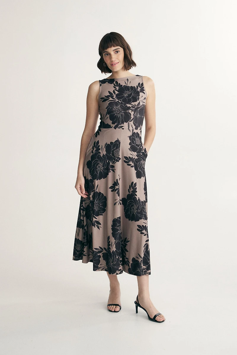 Élégante et fluide, cette robe maxi à imprimé floral présente une silhouette légère avec de grandes fleurs sur une base neutre. Dotée d’une coupe sans manches et d’une encolure haute, elle offre une allure moderne et épurée qui se porte aussi bien de jour que de soir, tout en étant fièrement confectionnée au Canada.