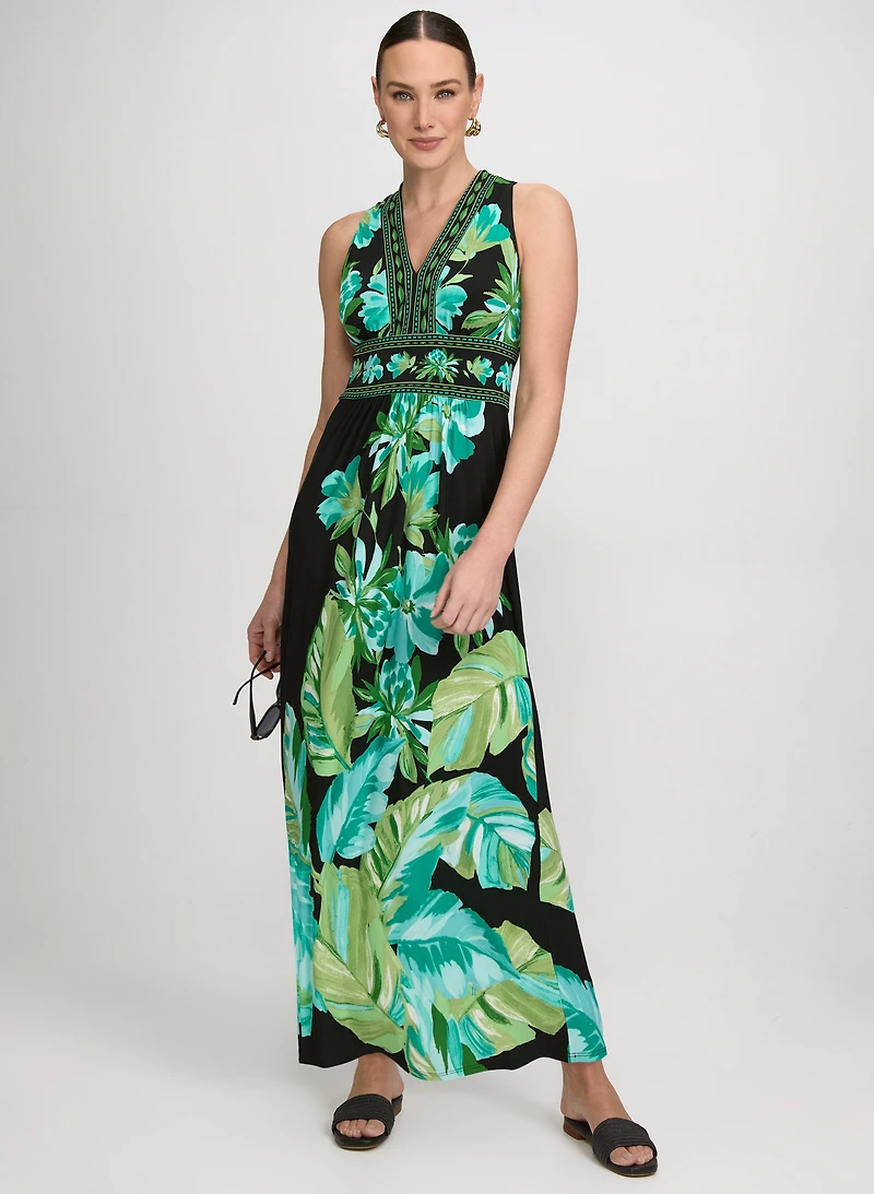Enfilez notre robe maxi légère à motif audacieux et élégant pour vos occasions spéciales. Associez-la à des accessoires discrets et à un sac en osier pour un look estival tropical.Motif paisley tropical floralEncolure en VSans manchesInsertion à la tailleMatière en jersey matLongueur plus courteLongueur à partir de l'épaule : 53 po
