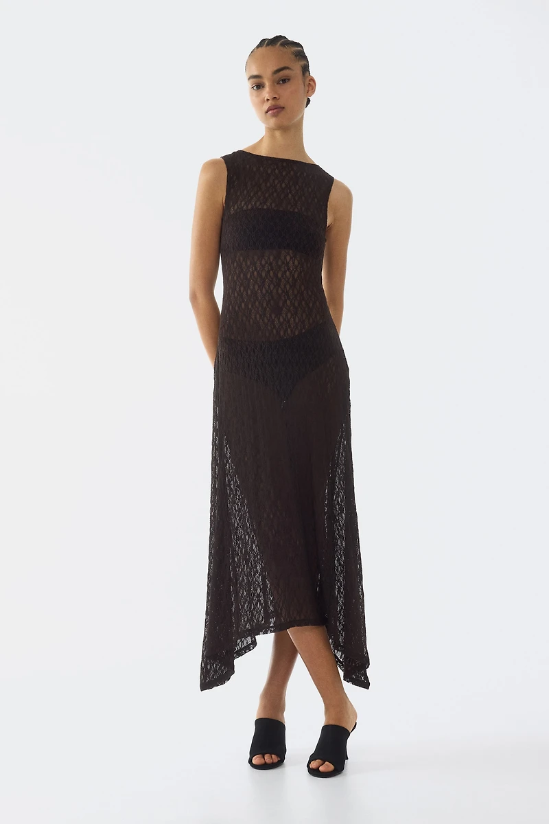Robe maxi sans manches en jersey dentelle. Modèle à encolure bateau avec jupe évasée et bas asymétrique. Non doublée.