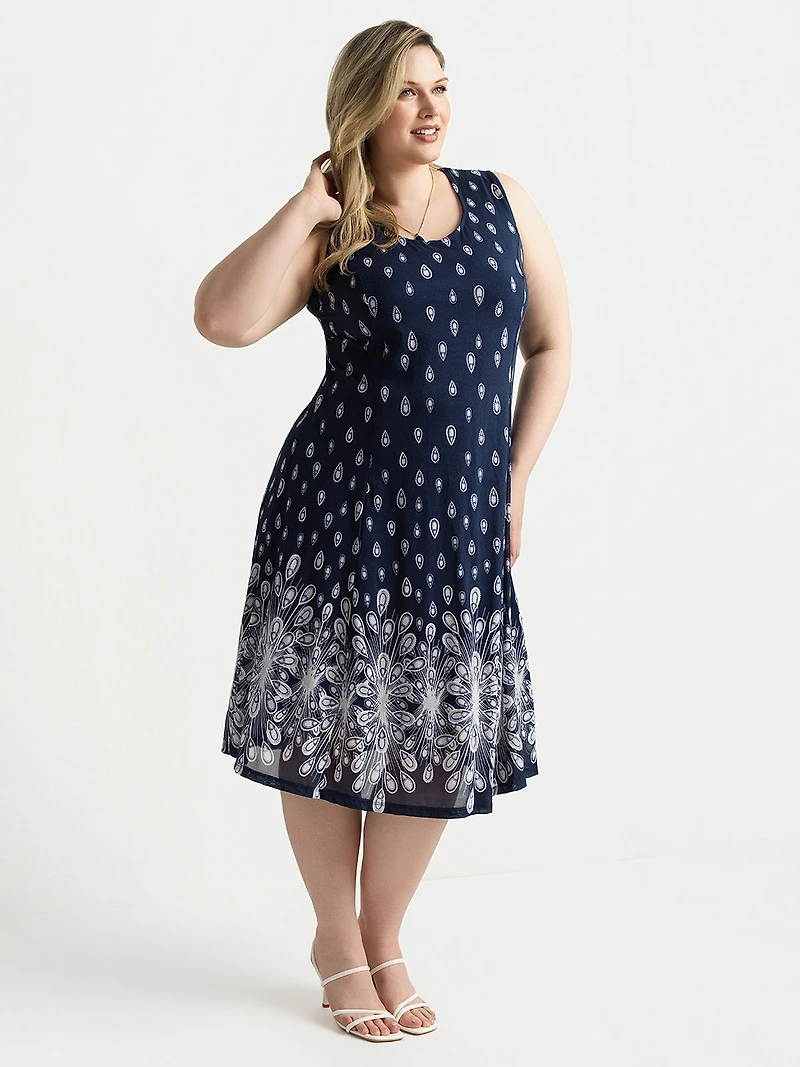 Robe sans manches en tissu tricoté à motif imprimé sur l'ensemble avec une encolure arrondie et des bretelles larges. La coupe est évasée et le bas présente un motif plus dense formant une bordure.