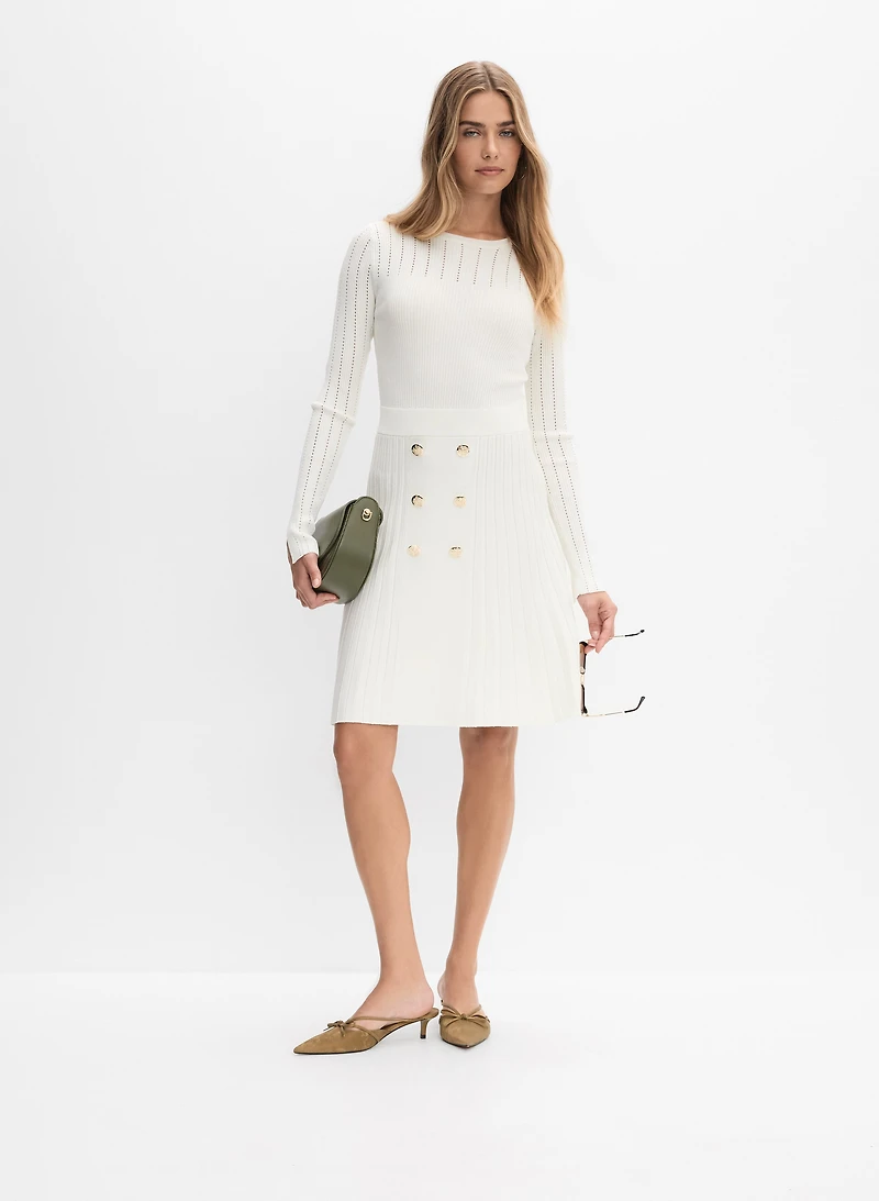 Parfaite pour le 9 à 5 et l'apéro d'après-bureau, notre robe pull cintrée et évasée est synonyme d'élégance décontractée. Associez-la à un sac à main de notre collection. Silhouette ajustée et évasée Tricot en pointelle Manches longues Encolure ras-du-cou Boutons dorés décoratifs Plis côtelés Longueur à partir de l'épaule : 36 po
