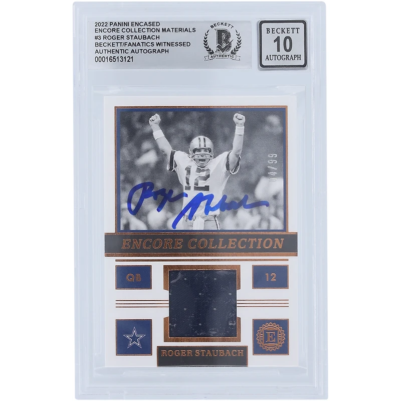Cette carte de collection Panini Encore 2022 autographiée par Roger Staubach Relic #EC-3 #/99 Beckett Fanatics Witnessed Authenticated 10 est prête à vous aider à afficher votre passion pour les Cowboys de Dallas. Dotée d'un boîtier en dalle, cette carte saisissante met en valeur la signature unique du quart-arrière du Temple de la renommée pour en faire l'objet de collection ultime.