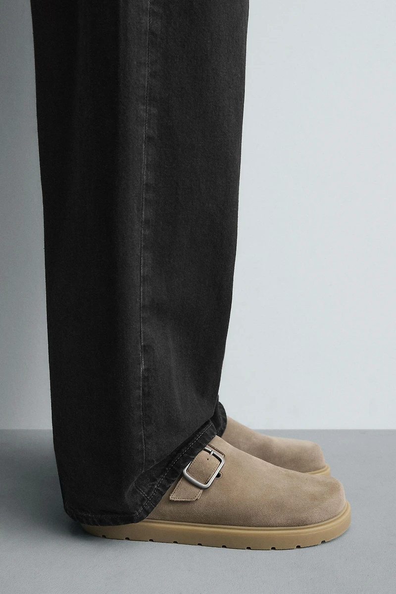 Sabot fabriqué en cuir avec fini croûte de cuir. Détail de boucle métallique sur le cou-de-pied. Forme arrondie. Semelle volumineuse en contraste de couleur.