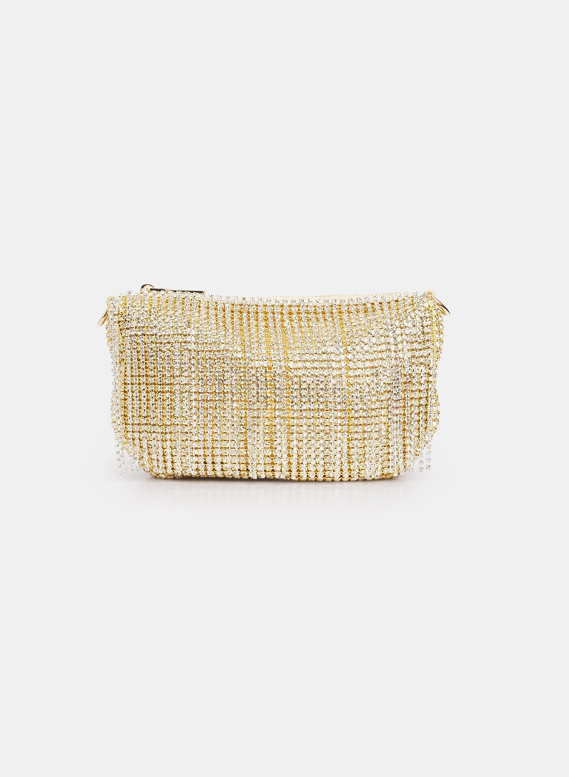 Notre pochette scintillante dorée se distingue par ses élégantes franges à l'avant qui apportent une touche moderne à votre tenue. Associez-la à un jean ajusté et à une blouse fluide pour un look décontracté et chic parfait pour vos sorties en ville. Devant à franges en cristaux Forme de demi-lune Bandoulière en chaine amovible Détails à cristaux Fermeture éclair Dimensions : 7,5 po x 5 po x 2 po