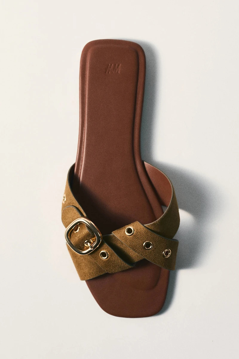 Sandales plates à bout carré avec brides entrelacées agrémentées d'une boucle et d'œillets décoratifs en métal sur le dessus.
