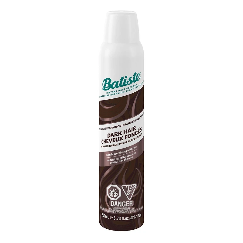 Le shampooing sec no 1 au Canada*Des bruns audacieux! Le soupçon de couleur conserve à vos cheveux leur intensité et aide à cacher la repousse à la racine et tous les cheveux gris apparents sans avoir à s’inquiéter des taches blanches.• Rafraîchit les cheveux en les laissant propres et frais• Absorbe l’excès d’huile pour ajouter du corps et de la texture• Permet de gagner du temps pour coiffer vos cheveux facilement et rapidement, vous permettant ainsi de profiter d’un sommeil réparateurSuper Truc : l'utilisation de Batiste entre les shampooings peut aider à prévenir la décoloration des cheveux teints - c'est une façon extraordinaire de prolonger le temps entre les colorations à domicile ou votre prochaine visite au salonNotes de couleur : Le shampooing Foncé divin est parfait pour toutes les nuances de cheveux foncés, qu’ils soient naturels ou teints. Chocolat, acajou ou ébène, nous avons ce qu’il vous faut. Utilisez-le pour éviter les résidus blancs et agrémentez votre couleur de douces notes de bergamote, de pêche blanche et de gousse de vanille.*Données en dossier