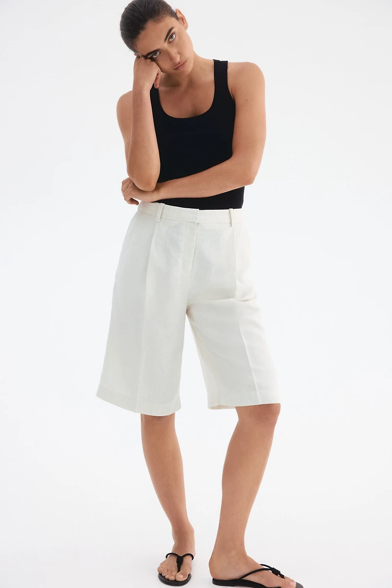 Short au genou en tissu de viscose et lin mélangés. Modèle avec pinces devant et braguette à fermeture éclair surmontée d'un bouton et d'une fermeture par agrafe et barrette dissimulés. Poches italiennes et poches raglan munies d'un bouton décoratif dans le dos. Jambes avec plis marqués devant et dans le dos.