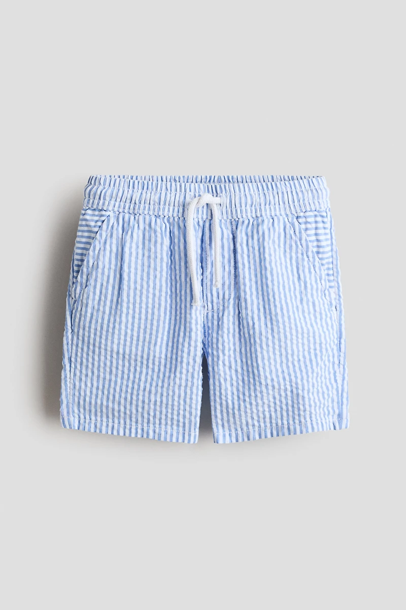 Short en crépon de coton doux. Modèle avec élastique et cordon de serrage à la taille. Fausse braguette. Poches italiennes et poche derrière.