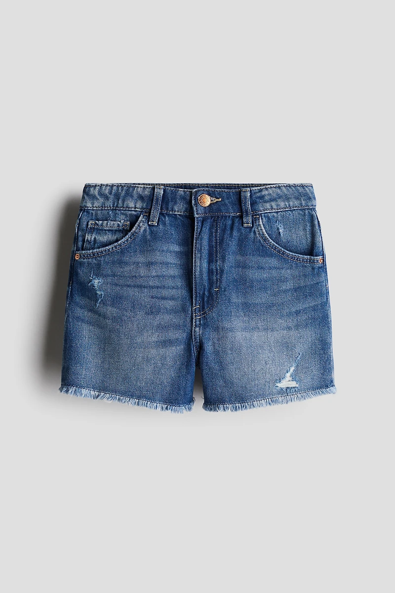Short 5 poches en denim de coton délavé. Coupe décontractée avec taille haute, élastique réglable dans la ceinture et braguette à fermeture éclair surmontée d'un bouton. Bord à cru frangé en bas de jambe.