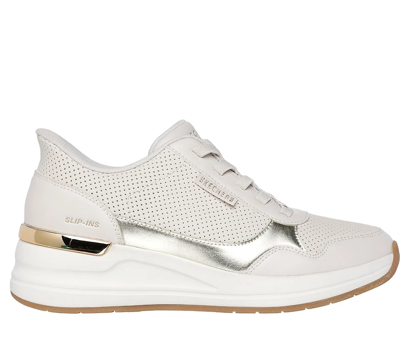 Brillez de mille feux avec le style et le confort urbain de la chaussure Skechers Street™ Hands Free Slip-ins® : Billion 2 - Top-Tier. Dotée de notre coussinet de talon Heel Pillow™, cette chaussure de sport à la mode Wedge Fit® comprend une empeigne en cuir durable perforé et superpositions métalliques, des lacets extensibles noués, un bridant de talon métallique et notre semelle intérieure emblématique Skechers Air-Cooled Memory Foam®.