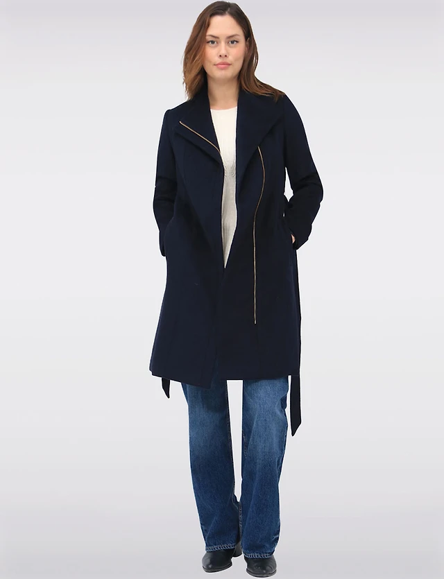 Sophisticated Wool Blend Zip Front Coat with Belt and Large Collar by Cole Haan