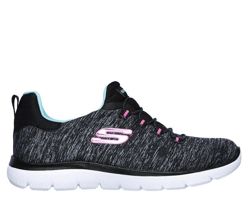 Optez pour le style sportifif et le confort en portant la chaussure SKECHERS Summits - Quick Getaway. Une empeigne en tissu à mailles jersey chiné et doux sur une chaussure d’entraînement athlétique à lacets élastiques et à enfiler, ornée de surpiqûres. Semelle intérieure à mousse mémoire.