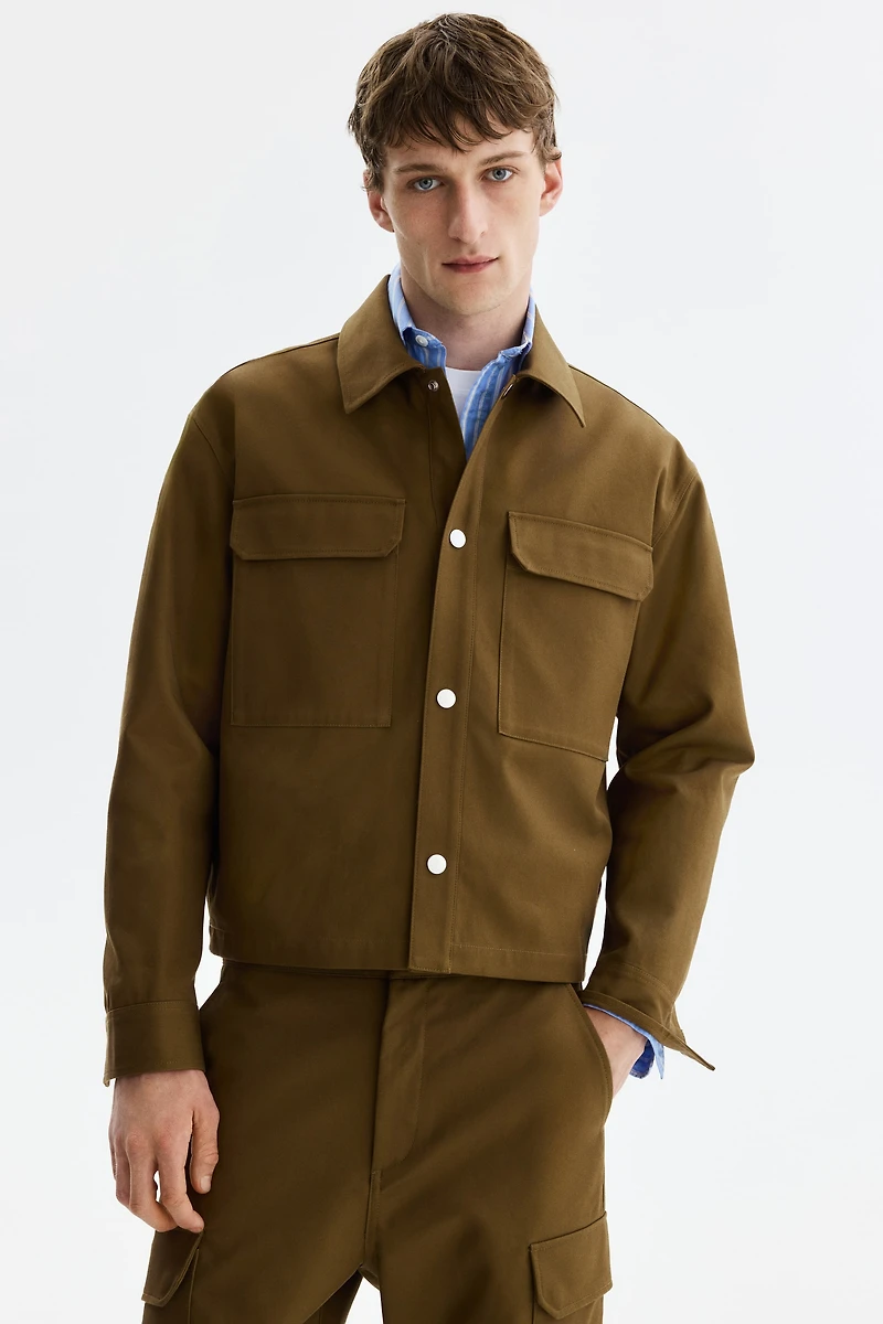 Surchemise en coton tissé. Modèle carré avec col rabattu, poches de poitrine à rabat et bande de boutonnage pressionnée devant. Manches longues terminées par poignet fendu et boutonné. Empiècement dans le dos. Bas droit avec patte pressionnée ajustable de chaque côté. Doublée.