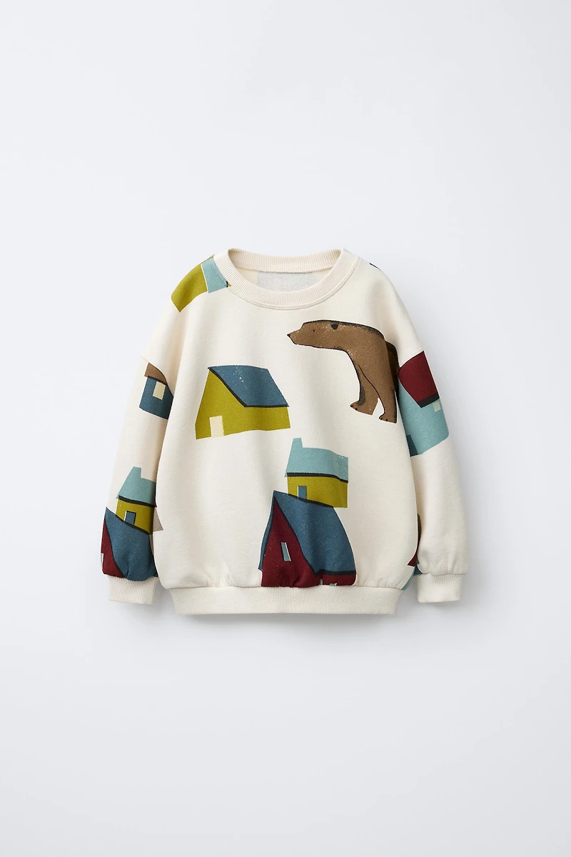 Sweat à col rond et manches longues. Finitions côtelées. Imprimé all over. Intérieur gratté, chaud et doux. Tissu 83 % coton.