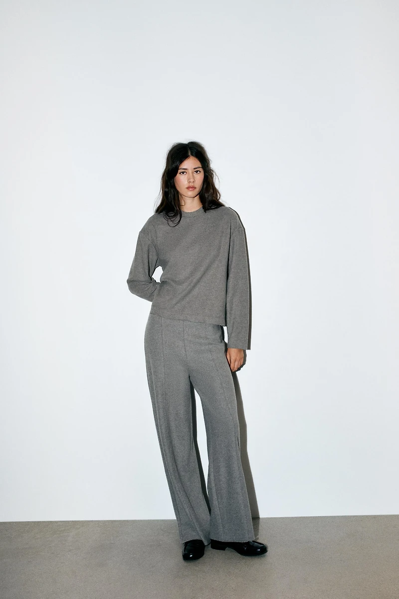 Sweat à col rond en maille côtelée ton sur ton et manches longues. Tissu doux. Base droite.