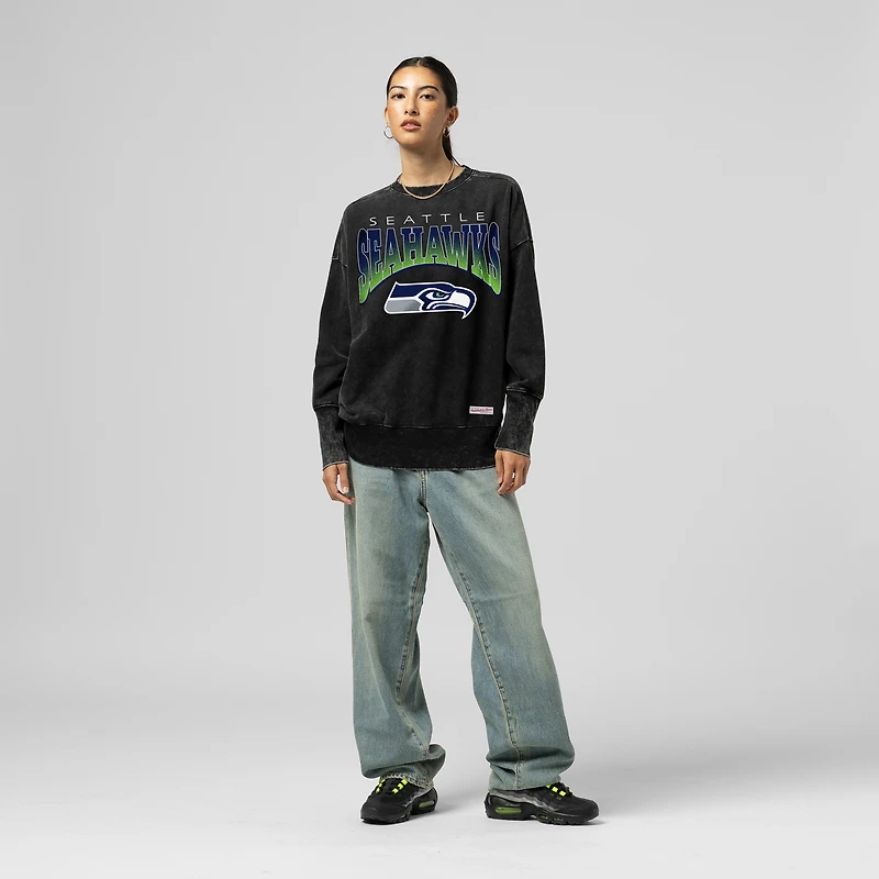 Sweat-shirt ras du cou noir délavé minéral pour femme Mitchell & Ness des Seattle Seahawks